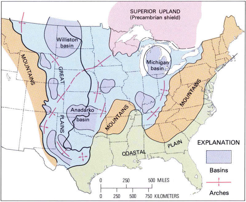 Figure 7.—Structural setting of the Great Plains. Williston basin and Anadarko basin are separated by a midcontinental arch.