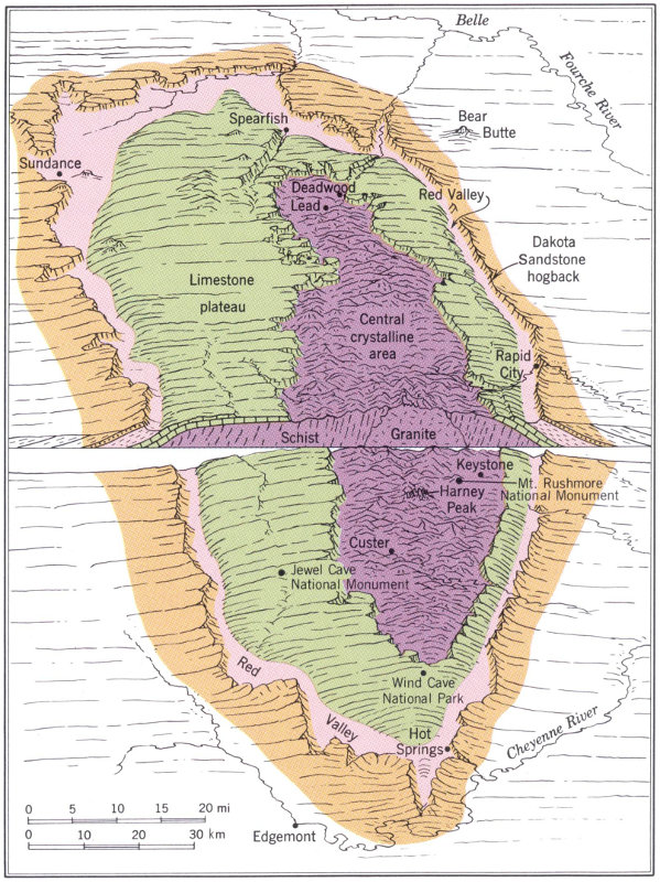 The Black Hills, then, is an uplifted area that has been carved deeply but differentially by streams to produce its major outlines. Those outlines have been modified mainly by weathering of the ancient core rocks and solution of the limestone of the Limestone Plateau.