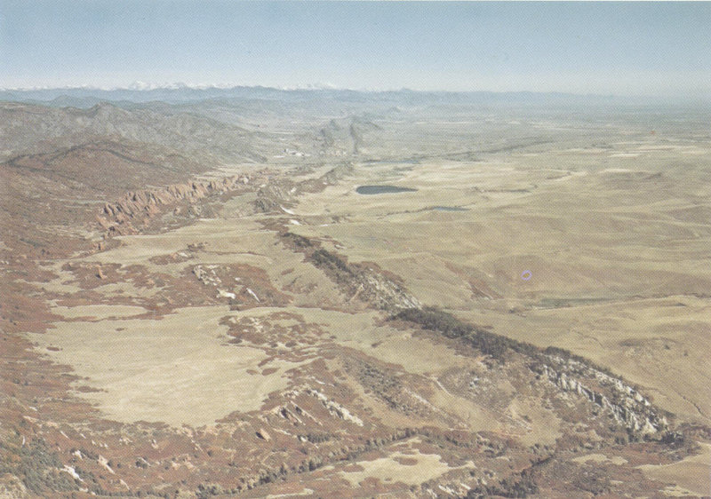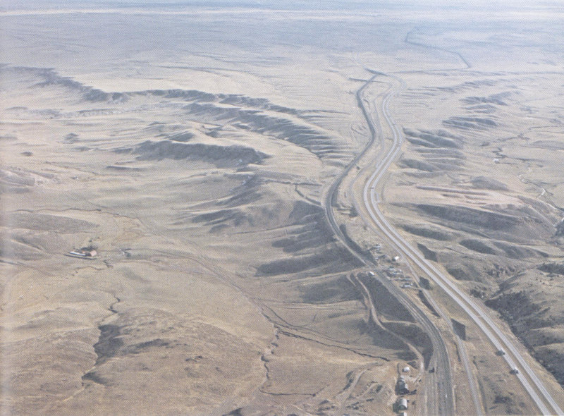 Figure 15.—Looking east toward Cheyenne at “the Gangplank.” Interstate Highway 80 and the Union Pacific Railroad follow the Gangplank from the High Plains in the distance onto the Precambrian rocks (older than 570 m.y.) of the Laramie Mountains in the foreground. Photograph by R. D. Miller, U.S. Geological Survey.