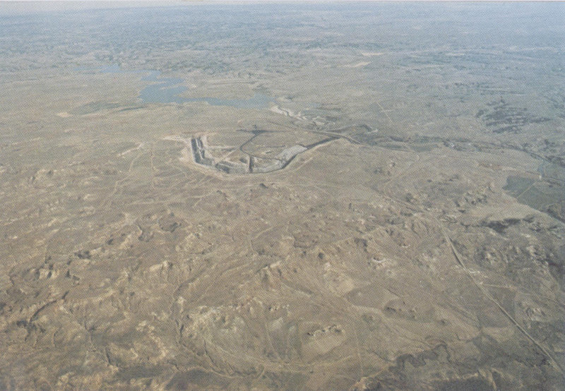 Figure 25.—View northeast across the Deckers coal mine and the Tongue River in the Powder River Basin, southeastern Montana. Typical terrain of unglaciated Missouri Plateau. Small mesas with cliffed escarpments on capping layer of resistant sandstone, such as those in the foreground, are common. Coal mine is about 1 mile across. Photograph by R. B. Taylor, U. S. Geological Survey.