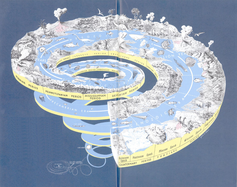 Figure 5.—Geologic time chart and the progression of life forms. Note Cretaceous Triceratops, Oligocene Titanotheres, and Miocene Moropus.