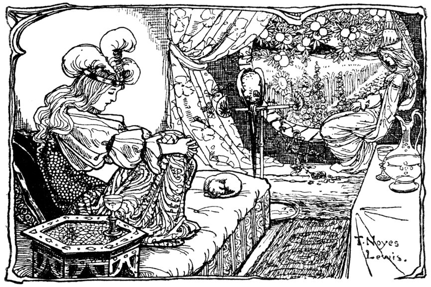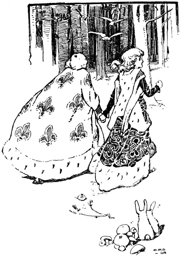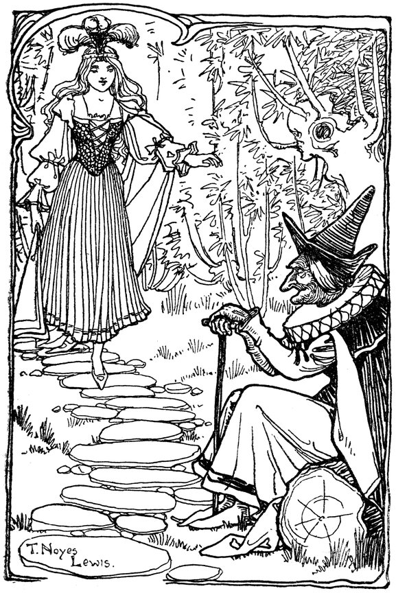 “Come,” he continued, “we three will go over those blue hills together, to my lovely country. And you shall be my Princess, and we will rule the land together.”