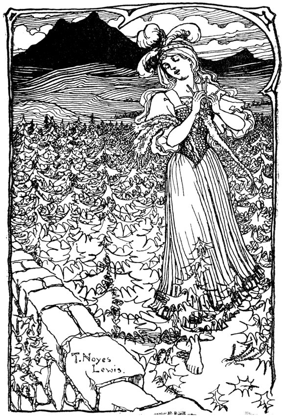 How loudly she sang! If she had not done so she must have cried out in agony, for the cruel nettles tore her poor arms and legs and feet. She had never known such nettles as these; nobody had ever known such nettles as these! She thought that she must really give up in despair, but she did not. She sang on, and she worked on, and she gathered those nettles near the roots, and wove them, with her poor hands, into seven plaits. Then wearily and slowly, but indeed happily, she went back the way she came, and to the Blue Mountain, and to the lake on its summit.
