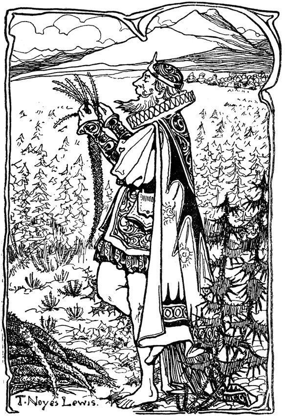 He called his courtiers and his people together, and in their presence he journeyed to the Blue Mountain and thence to the Yellow Mountain, and he climbed its steeps and descended to the other side. And when he came to the 20fields of nettles he took off his shoes and stockings and bared his hands, and then he stepped into the cruel weeds, singing all the time.
