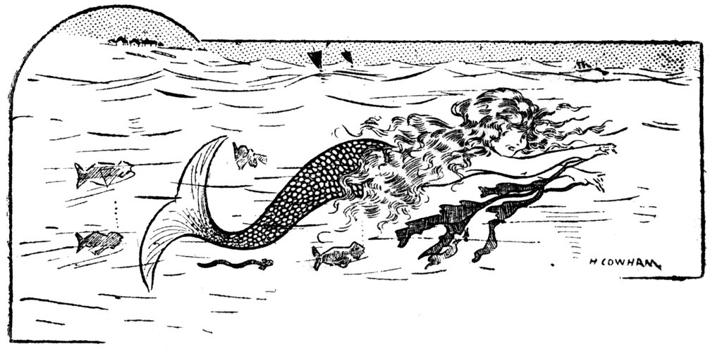 Now what made matters even worse was that this little fairy fish was in reality a beautiful mermaid—a beautiful mermaid with hair like the golden sands, eyes as blue as the sea, and lips as red as coral. But this was in her own country, some miles away in the rolling ocean. In her own country, too, she had the wonderful power of being able to change her shape. The pretty mermaid could become a sole, or a lobster, 25or an oyster, but unfortunately she had not this power out of her own country.