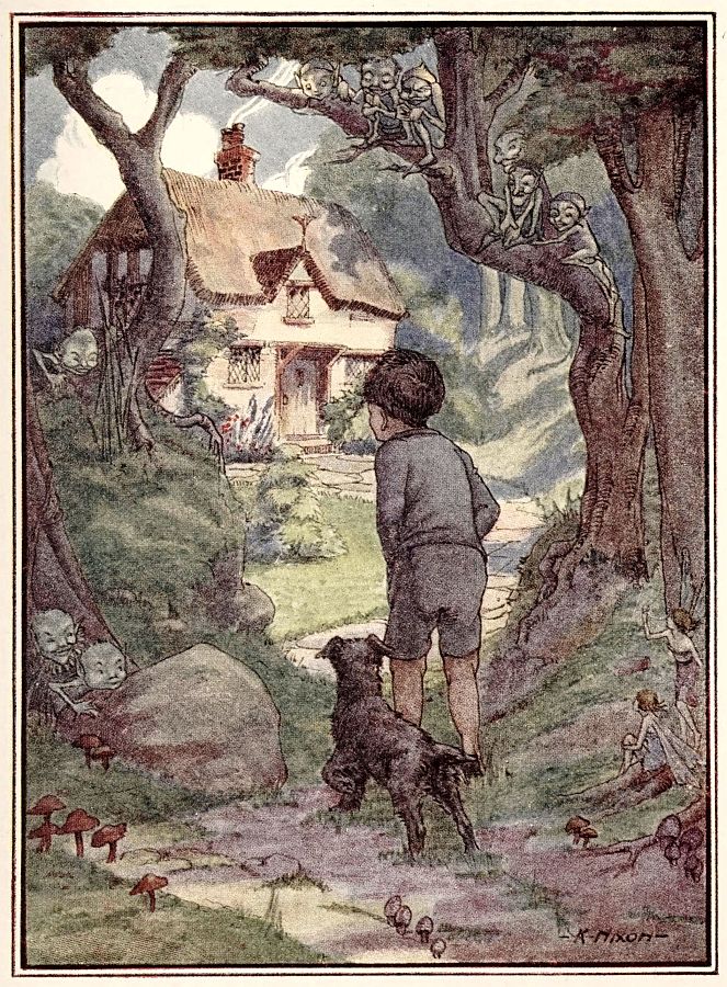 George and Alexander set out in search of adventure. The dream-music calls to him again. Can dogs talk? "Wish as hard as ever you can!" Just like a bit of a story-book! The little green gate. The delightful little house in the wood, and the tea waiting there for George and Alexander. The Land of Dreams.