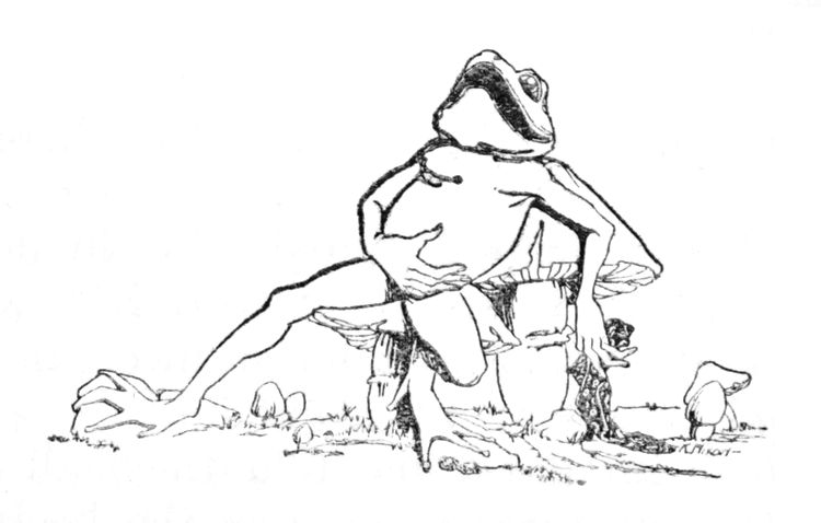 But the old frog didn't answer. He made all kinds of queer noises, blew himself out like a balloon, and really frightened the fairies. They ran as fast as they could with dewdrops and honey-balls—their medicine, you know—to help him.
