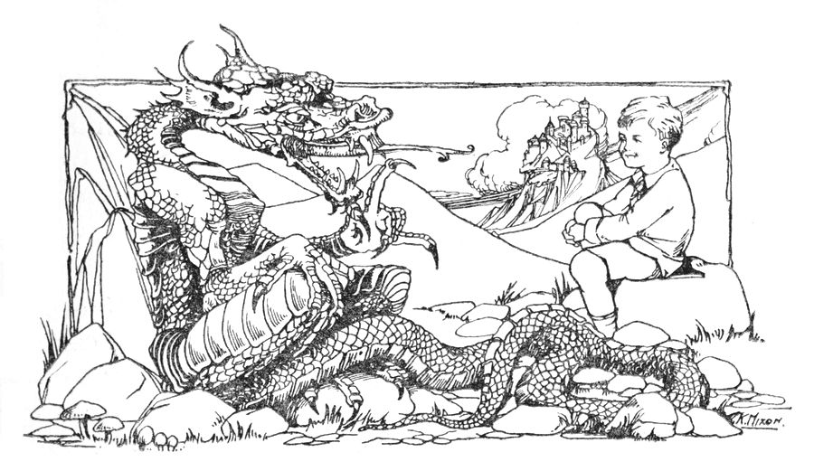 All about the wonders in this strange country. "She lives not far from here." Oh, it was ever so much bigger than one expected! A game at 'catch-my-tail.' The dragon who went to look for his fortune. George is told that he is not real. A ride on the dragon's back.