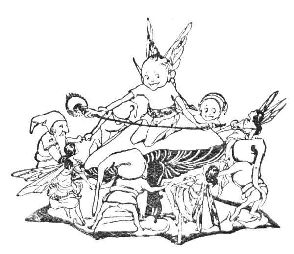 Where was he? He seemed to be moving along. He was actually in a carriage which was being dragged along by any number of these tiny people. On the box sat a little figure—could it be Tom Tiddler? He guessed all in a flash it was—of course, you've guessed it too—Puck.
