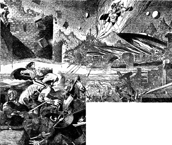 Whirling, he saw the pillars of the house to the right buckle, saw the huge stone slabs of the roof come thundering over the top and streetward. For a blinding instant he saw Valduma, riding the slab down, yelling and laughing, and then she was gone and the stone struck.