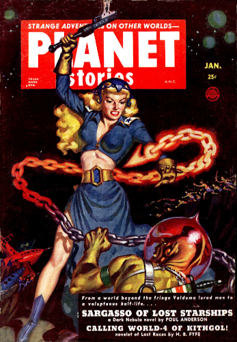 "Besides," went on Donovan, his voice dry and toneless as a lecturing professor's, "they can only do so much at a time. I don't know where they get the power for some of their feats, such as leaving this planet's gravitational well. It can't be from their own metabolisms, it must be some unknown cosmic energy source. They don't know how it works themselves, it's an instinctive ability. But it takes a lot of nervous energy to direct that flow, and I found last time I was here that they have to rest quite a while after some strenuous deed. So if we can get them tired enough—and the fight is likely to wear both sides down—they won't be able to chase us till we're out of their range."