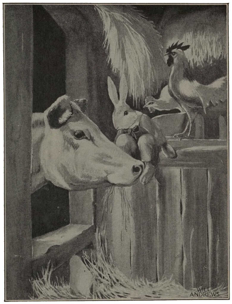Then Tommy marched all the way up to the house and got his cap full of the same delicious meal he had given Nibble and the White Cow the day the Red Cow chased him. It was “Thank you” to them for helping him get away from her. He set out two little piles. Then he called: “Here Bunny, Bunny, Bunny!” And that showed Nibble that one of those piles was for him. So Watch was right. It was nice to be Tommy’s rabbit.