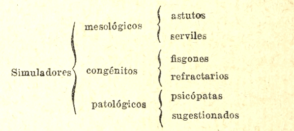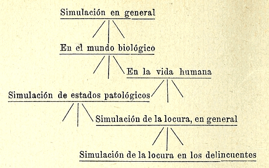 En éstas hallaremos la clave para estudiar las simulaciones humanas de toda índole, unificadas por el mismo propósito de la mejor adaptación del simulador a las condiciones del ambiente donde lucha por la vida. Entre ellas discerniremos, como hecho general, la simulación de estados patológicos, una de cuyas formas—la más importante para la psiquiatría y la medicina legal—es la simulación de la locura en general.