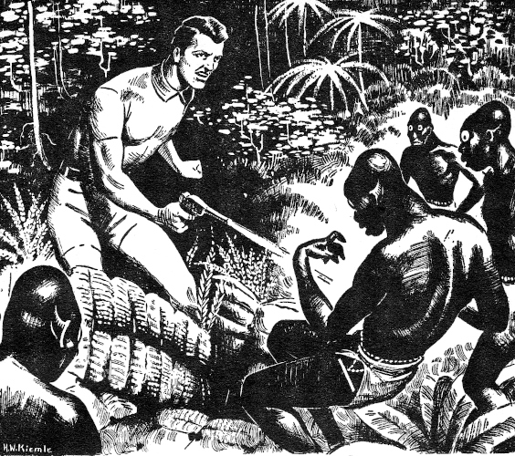 He laughed again and wiped the last particles of the meal from his lips. The food was making him sleepy. Gratefully he allowed leaden lids to close over sun-dazzled eyes. A keen sense of danger prodded his drowsy mind, telling him to awake, to throw off the torpor before the perils of the jungle closed in on him.