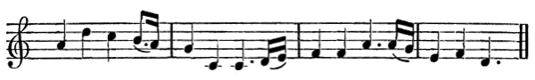 This last definition of folk-song, as “song and melody born of the people and used by the people as an expression of their emotions, and (as in the case of historical ballads) for lyrical narrative,” is the one adopted in these pages and that generally recognised by the chief collectors and by the Folk-Song Society. In addition it may be mentioned that folk-song is practically almost always traditional, so far as its melody is concerned, and, like all traditional lore, subject to corruption and alteration. Also, that we have no definite knowledge of its original birth, and frequently but a very vague idea as to its period. [Pg 11]
