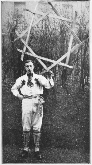 It is of the utmost importance that the nature of these dances should be clearly kept in mind by those who are responsible for their continuance. Until six years ago they were unrecorded in manuscript or print, they were only in the memory of the remaining Morris men, most of them old and quite unlettered, and there was no language in which to express the steps and evolutions but that invented by these peasant men. Neither could these cryptic sayings, such as “foot up,” “half hands,” “hey sides up,” “gipsies,” “half rounds,” etc., etc., be interpreted except by a patient watching of the dancers on the few occasions when they could be got together to give a demonstration. [Pg 169]