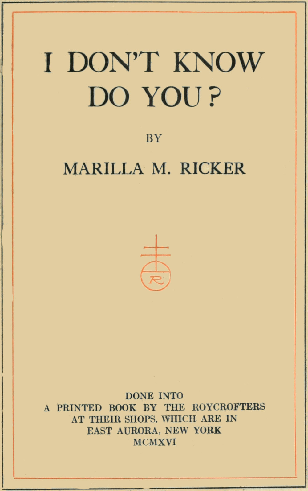 SO HERE THEN ENDETH THAT GREAT AND GOOD BOOK "I DON'T KNOW—DO YOU?" WRITTEN BY MARILLA M. RICKER, AND PRINTED AND BOUND FOR HER BY THE ROYCROFTERS AT THEIR SHOP, WHICH IS IN EAST AURORA, ERIE COUNTY AND STATE OF NEW YORK, MCMXVI.