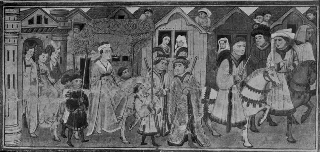 L'année suivante la nouvelle parvenait à Munich qu'Élisabeth, fille du duc Frédéric, n'avait survécu que quinze jours à son mari Marco Visconti[52]. Les liens qui unissaient la Maison de Bavière au duc de Milan se trouvaient ainsi rompus; mais Frédéric les renoua en épousant en secondes noces, Madeleine Visconti, sœur de Thadée[53]. Les fêtes de ce mariage ne furent qu'une courte diversion aux graves préoccupations politiques des Wittelsbach; maintenant la jeune Élisabeth ne voyait[Pg 28] plus autour d'elle que des visages contristés ou irrités; elle n'entendait plus que des menaces ou des plaintes. L'insurrection des villes souabes contre l'Empereur et les princes avait gagné la Bavière; Ratisbonne se soulevait, Frédéric et Etienne partaient pour en faire le siège. Des prodiges inouïs éclataient[54]; l'apparition d'une comète à longue crinière effrayait toute la contrée; on massacrait les Juifs. Un moment Élisabeth put croire que de terribles calamités allaient fondre sur les siens. En 1384 Frédéric et Etienne se brouillèrent avec leur frère Jean, à propos du règlement de leurs pouvoirs respectifs[55]; la querelle fut de courte durée, mais Munich, qui avait embrassé le parti de Jean, faillit payer chèrement sa préférence: dans le but de la châtier, Etienne et Frédéric avaient déjà rassemblé une armée, lorsque les bourgeois de la ville leur envoyèrent des députés pour capituler. Les ducs firent grâce, mais à des conditions humiliantes. Élisabeth put voir[Pg 29] son père et son oncle reçus aux portes de Munich par tous les habitants contraints de les acclamer tandis que, à genoux, les principaux leur présentaient les clés[56]. Alors, au Ludwisburg, la vie reprit un cours paisible.