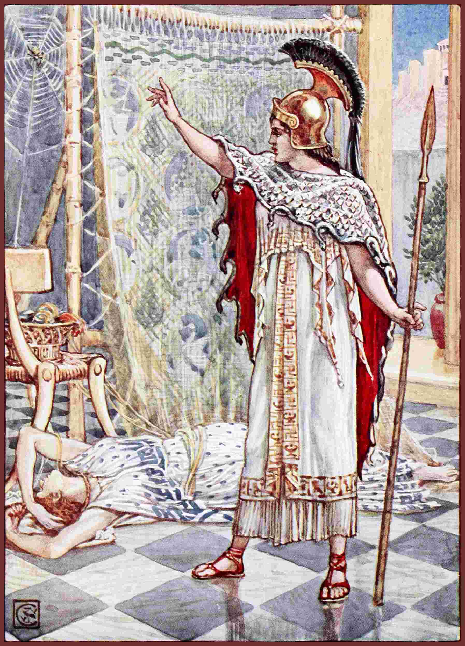 As he had not money enough to pay the fine, he was thrown into prison. Before long he escaped and fled to the sea-coast town of Ægina, not far from Athens. Often he350 would sit on the shore or pace up and down the sands, looking wistfully toward the city he loved.