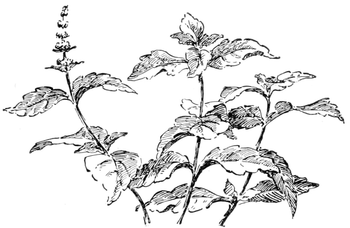 It was an Englishman who once said that “mint made lamb out of an old sheep”! Perhaps he loved it also because of the legend that it once existed in the form of a beautiful maiden, transformed[Pg 21] by Persephone into the modest aromatic of our gardens. The mint designated is that member of the labiate family known as spear mint, native to Europe but grown in all portions of the United States and largely marketed. It is a small, green herb, the leaves being highly aromatic and, when bruised, yielding a valuable essential oil. It is equally liked in the mint sauce so indispensable to mutton and the mint-julep—