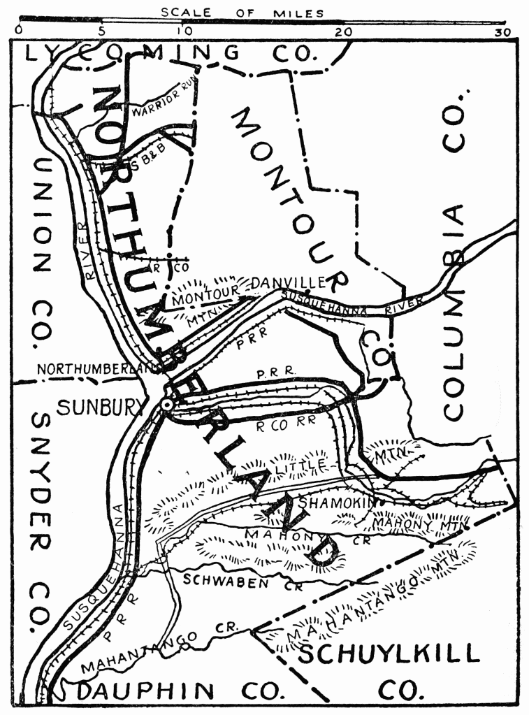 At the top of the mountain, on the road toward Sonestown, is “Fiester’s View,” where the deep valley of Muncy Creek, walled on the east by the towering North Mountain, 3000 feet above tide, near Nordmont, is beautiful beyond description. At the junction of the Big and Little Loyalsock Creeks is the pretty little town of Forksville. Dr. Priestly purchased a large tract of land about here, laid out roads, and made many improvements. Four miles distant, on the state highway toward Hillsgrove, on Kings Creek, is Lincoln Falls, a waterfall about 30 feet in height at the head of a gorge with perpendicular walls of rock, varying from 50 to 80 feet in height. A few deer, quite a number of bear, foxes, rabbits, and squirrels are in this county; a state game preserve is in the southeast near Jamison City. There are some good trout streams, and the lakes are well stocked with fish. The most valuable industry is coal from the Bernice coal fields in the east. The production of hemlock tanned sole leather is important. Farm products and dairying are general.{480}