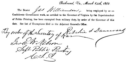 In the house where I had taken board there was a gentleman who was employed in the printing office doing the work of the State and Confederate Governments. Learning that I had been in the Government Printing Office in Washington, he said they would be[16] glad to have me at this office. I told him I expected to join my friends from Baltimore; that we were anxious to be together in the Confederate army. He said, “You can be of service on this work just now, and we are badly in want of help.” I accordingly went to Ritchie & Dunnavant’s, the parties having charge of this work.