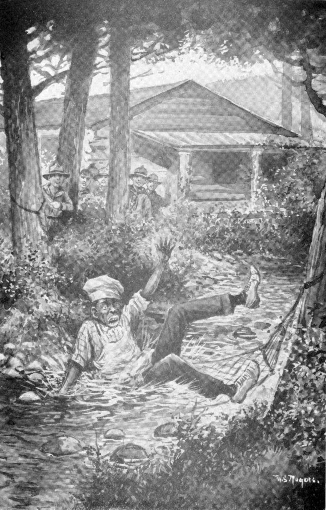 Thereupon, sitting on the bungalow porch with the boys around him, the colored man gave the particulars. He said that he had caught the three boys behind the shed at the Willoughby camp smoking and playing cards. They were talking about old times and did not notice him when he went into the shed. He heard them mention a fire at the Colby Hall boathouse and, listening,[300] found that it had been caused by Flanders and his two cronies.