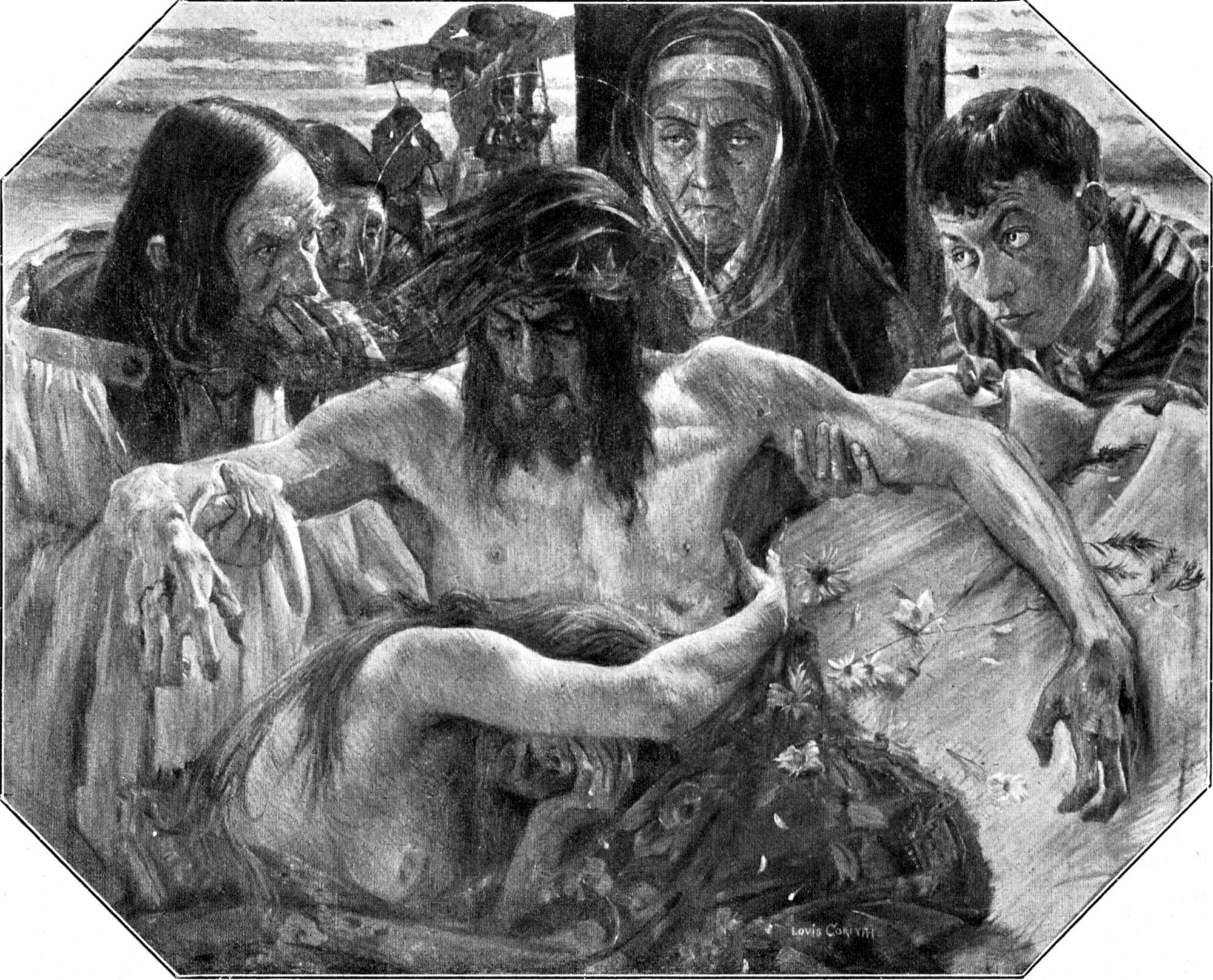In der genremäßigen Auffassung erscheint der „Schnapsriecher“ vom Jahre 1889 dem zuletzt genannten Bilde nahe verwandt (Abb. 11). Auch dieses Stück ist nicht ohne besondere malerische Note und entfernt aus Halsschem Geiste geboren. Aber es steht doch bedeutend zurück hinter der im selben Jahre entstandenen ergreifenden „Pietà“, die heute das Magdeburger Museum sein eigen nennt (Abb. 13). Hier begegnet uns zum erstenmal ein Thema, das im Schaffen Corinths seine hervorragende Bedeutung hat, und es mag an dieser Stelle zurückgreifend auch an die Einschätzung erinnert werden, die einleitend bereits dem Meister als religiösem Maler kurz zuteil wurde. Unter allen Beweinungen, die die christliche Kunstgeschichte geschaffen hat, wird man dieses Bild eines unserer Modernsten so leicht nicht vergessen. Denn es ist nicht nur von ergreifender Stimmungsgewalt, sondern in der diagonal gefaßten Komposition, in der meisterhaften Behandlung des toten Körpers eine der stärksten Talentproben dieser Jahre. Und was bei späteren Schöpfungen an allzu kräftig aufgetragenem Realismus der Auffassung leicht verwirrt, ist hier völlig ausgeschaltet. Das von bläulich-weißem Ton bestimmte, mit Asphalt gemalte Bild wirkt gerade durch die diskrete Behandlung dieser schmerzerfüllten Szene so ungemein wohltuend, und etwas Bezwingendes hat die Art, wie hier das Licht, das voll auf die ausgebreitete Leinwand trifft und die Körper mit hellen Reflexen trifft oder tiefe Schatten webt, die Gesamtkomposition in Harmonie verstrickt. Wer aber dem Meister gern seine auf ähnlichen Szenen allzu realistische Art vorhält, vergesse nicht, daß er hier als Dreißigjähriger eine Schöpfung gegeben hat, die — wie wir wissen — ganz aus einem tiefen Gefühl, aus einer bis zur Weichheit gestimmten Seele heraus geformt wurde.