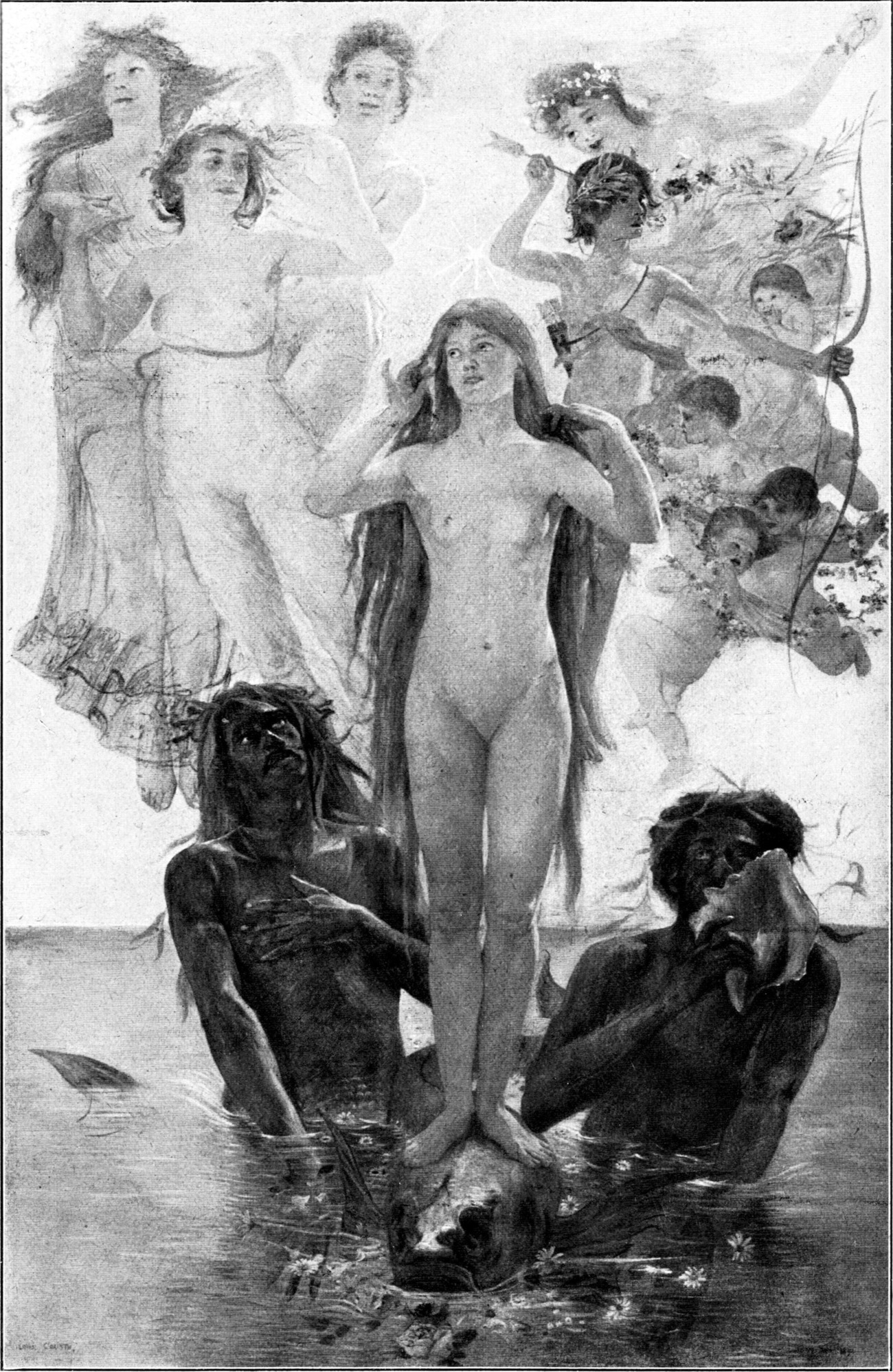 In dem lustigen „Bacchanale“ vom Jahre 1896 dagegen, das einstmals in München, für uns heute unbegreiflich, abgelehnt wurde, enthüllt sich das Dionysische heiterer Lebenskunst, mythologisch verklärt, in reinster Form (Abb. 26). Botticellische Frühlingsstimmung paart sich auf diesem Bilde mit dem tanzfrohen Rhythmus bewegter Gestalten. Derbe Sinnenfreudigkeit sucht einen Gleichklang in der blumensprießenden Landschaft. Ein dekorativer Zug beherrscht die Komposition, der später nur selten ähnlich begegnet. Diesem Werke nahe verwandt ist die auf eine ähnliche Note gestimmte „Geburt der Venus“, die vielleicht in noch höherem Maße die Erinnerung an den genannten Meister des ausgehenden Florentiner Quattrocento wachruft (Abb. 28). Vielleicht darf man in diesem Bilde auch entfernt Böcklinsche Reminiszenzen vermuten, obwohl man gerade dieses Meisters Einfluß sonst bei Corinth am wenigsten feststellen kann; das Verlangen nach dekorativer Wirkung ist auch hier unverkennbar.