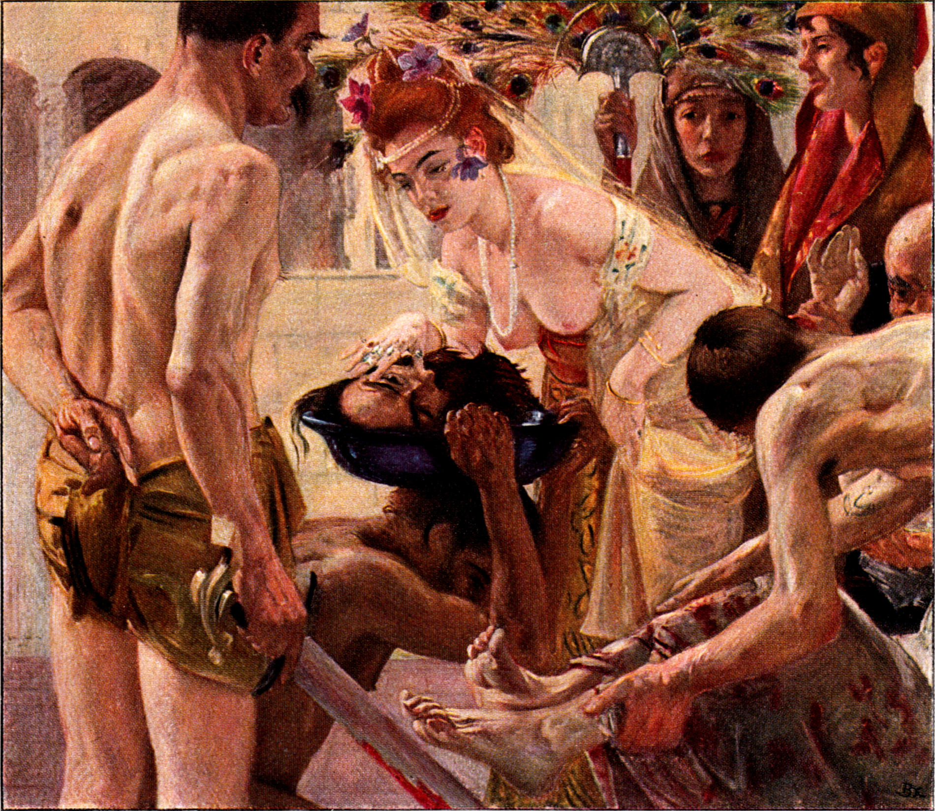 Trotzdem aber bezeichnet die im Jahre 1900 erfolgte Übersiedlung des Meisters nach Berlin den wichtigsten Wendepunkt in seinem Leben, und es ist ganz augenfällig, wie von nun an nicht nur seine Produktionsfreudigkeit im großen zunimmt, sondern wie sich auch die künstlerischen Kräfte immer freier entfalten. In der Beziehung mutet die gegen Ende 1899 gemalte große „Salome“ im Besitz der Frau Carl Toelle in Barmen wie ein erster Auftakt auch zu einem neuen koloristischen Stil an, nicht nur weil die Farbigkeit rhythmisch mehr gesteigert ist, als auf früheren Bildern dieser Art, sondern weil auch der Pinselstrich an kaum verkennbarem Schmiß gewonnen hat. Aber auf diesem Werke überrascht auf der anderen Seite nicht minder auch die Diskretion, mit der Corinth hier eines der blutrünstigsten Themata der Kunstgeschichte behandelt hat. Nichts wild Perverses schlummert in dieser Salome, sondern — sähe man nicht den Kopf des Täufers — so käme man fast auf die Vermutung, Corinth habe hier eine jener morgenländisch heiteren Szenen aus „Tausendundeiner Nacht“ gestaltet, als sei es ein lustiges Spiel, den Vorstellungen eines fernen Traumlandes entnommen, was sich hier vor unseren Augen enthüllt (Abb. 46). Mehr Hauptaktrice in der Johannestragödie im wahrsten Sinne des Wortes als diese mit einem Unterton des Dekorativen inmitten einer orientalischen Szene behandelte blutdürstige Königstochter ist jene Eysoldt als Salome, die er später nach dem Leben gemalt hat (Abb. 51).