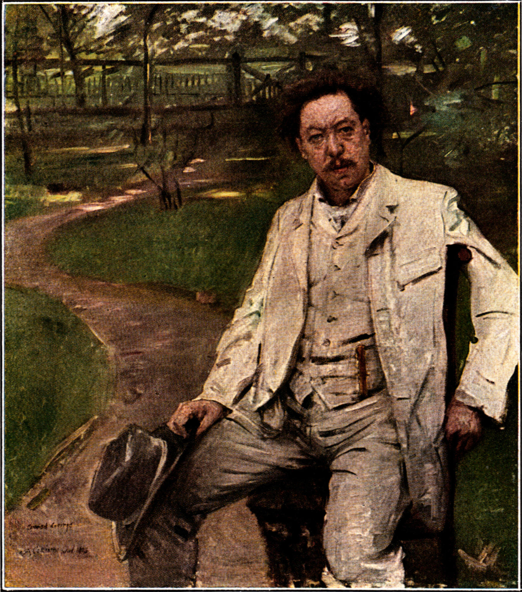 Das überaus fruchtbare Jahr 1904 erhält eine besondere Bedeutung auch durch die imponierende Zahl zeitgenössischer männlicher Porträts, die mittelbar die engen Zusammenhänge unseres Meisters mit dem übrigen geistig-künstlerischen Leben seiner Epoche dartun. Allen voran ist hier das einfach erfaßte, aber von hoher geistiger Kraft und starker Charakteristik erfüllte Bildnis des Malerkollegen Hans Olde zu nennen, dem Corinth von der Löfftzschule her befreundet gewesen ist (Abb. 65). Daneben fesselt das auf den ersten Blick vielleicht ein wenig fremdartig ansprechende Bildnis des Dichters Gerhart Hauptmann, der — wie wir sehen werden — mittelbar durch sein Schaffen in die künstlerische Entwicklung Corinths mehr als einmal eingegriffen hat. Dieses Hauptmann-Porträt versucht mit aller Energie das geistig Bedeutsame des interessanten Kopfes auszudrücken, und man darf sagen, daß in diesem Antlitz wirklich ein Widerschein jener Stunden aufzuleuchten scheint, die uns die „Versunkene Glocke“, den „Florian Geyer“ und so vieles andere geschenkt haben (Abb. 53). Als malerische Leistung erscheint das[S. 77] ebenfalls in diesem Jahre gemalte Bildnis des Pianisten Conrad Ansorge (heute im Besitze der Sezessionsgalerie in München) ungleich bedeutender (Abb. 62). Aber auch dieses Porträtstück kann die Höhe einer der geistigen Größe des Dargestellten gleichwertigen Potenz im Künstlerischen nicht verleugnen. Wie hier der Pianist ganz zufällig in seinem Garten sitzt — der für sich betrachtet ein köstliches Landschaftsbild darbietet — wie aber trotzdem das durchfurchte Antlitz, hinter dem eine echte Leidenschaft zu schlummern scheint, das Auge des Betrachters immer wieder in seinen Bann zieht, das zeugt von einer selbstverständlichen Größe des Einfühlens in das Wesensstarke des Dargestellten, die staunen macht, die mehr noch die Diskretion in der Bewältigung einer so schwierigen Aufgabe, wie sie nur der höchsten Könnerschaft zu lösen vergönnt ist, bewundern läßt. Man darf sagen, daß Corinth auch in späteren Jahren über diese Summe künstlerischer Intuition bei Porträtaufgaben nicht hinausgekommen ist, vielleicht weil ihm fast nie wieder[S. 78] ähnliche Menschen begegnet sind, die ihn um ihrer Bedeutung willen innerlich in gleichem Maße erregt haben; es sei denn, daß man ihn selbst mit seinen Selbstbildnissen in eine Parallele dazu stellen will.