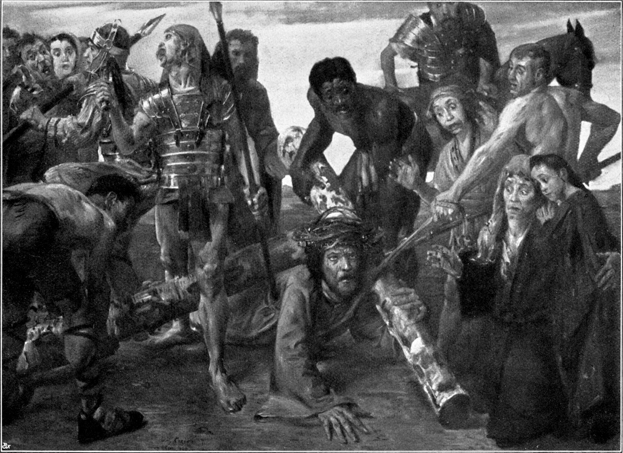 Aus dem folgenden Jahre stammen zwei Bilder, die Corinth wiederum von einer neuen Seite kennen lehren und doch an früher gekennzeichneten Punkten anknüpfen, denen der Meister auch in seiner Selbstbiographie bedeutsam genug Erwähnung getan hat. Man erinnere sich an die Königsberger Zeit, wie er mit dem Onkel Fleischer den Schlachthof zu besuchen und hier nach den Tieren zu zeichnen pflegte. Bei der Schilderung des Pariser Lebens aber verweilt Corinth auch bei dem schönen malerischen Eindruck, den die Schlächterläden der französischen[S. 58] Hauptstadt auf ihn gemacht haben. Solche Reminiszenzen mögen für ihn bei der Entstehung jenes ersten bedeutenden „Fleischerladens“ mitgewirkt haben, den er bei einem Besuch in Unterschäftlarn an der Isar 1897 gemalt hat (Abb. 32). Es ist ein malerisch ungemein feines, koloristisch in seinen weiß-roten Tönen stark vertieftes Bild, auf dem die Wirkung des Lichtes wiederum eine hervorragende Rolle spielt. Etwas skizzenhafter ist das „Stallinnere“ gegeben, bei dem man entfernt an Zügelsche Motive denken könnte, wenn nicht die malerische Handschrift auf einen so viel ursprünglicheren Künstler hinwiese, der hier seinem Stoffgebiet ein neues, ziemlich vereinzelt gebliebenes Thema anzugliedern bemüht ist (Abb. 33). Dagegen begegnen in den beiden anderen Hauptbildern dieses Jahres, den „Hexen“ und der prachtvollen „Kreuzigung“ in der Kirche von Tölz, von früher her bekannte Motive, so neu auch die Themen im einzelnen sind. Das erstgenannte Werk zeigt in drastisch derber Auffassung eine genreartige, aber doch stark realistische Szene Münchener Lebens, wie etwa ein hübsches Modell für die Redoute vorbereitet wird und wie die neugierigen Gevatterinnen aus der Nachbarschaft baß erstaunt sind über die frische, vielleicht ein wenig zu üppige Schönheit der jungen Hexe, die eben ihre Toilette beendet und kommenden Freuden des Abends entgegenlacht[S. 59] (Abb. 36). Das Bild hat in dem Gegensatz von Hell und Dunkel und speziell in der Gruppe der alten Weiber Momente, die entfernt an Velazquez gemahnen könnten, so gesucht auch dieser Vergleich hier anmuten mag. Hat Corinth hier dem Leben eine etwas indiskrete Szene abgelauscht, so erschüttert der tragische Ernst jener ersten großen Kreuzigungsgruppe, die später von andrer Seite der Kirche in Tölz geschenkt worden ist (Abb. 38). Hier ist nichts, was nicht von der höchsten Meisterschaft des Könnens kündet, und so grausam realistisch auch alle Gebärden dieser Schöpfung sein mögen, so überwältigend ist doch die furchtbare Klage der vier Menschen, die den verscheidenden Heiland umstehen, dessen Erscheinung wie jener Christus am Kreuz von Grünewald im Museum zu Kolmar die Züge des Duldens mit dem göttlich hohen Erlösergedanken verwebt. Prachtvoll ist die Gestalt der[S. 60] klagenden Magdalena, wunderbar echt der tiefe fragende Schmerz, der sich im Antlitz des Johannes spiegelt, welcher die in Ohnmacht dahinsinkende Gottesmutter stützt. Vielleicht, daß ohne die Grimassen schneidenden Gesichter der beiden Schächer das künstlerische Moment dieses Bildes noch besser zum Durchbruch käme — vielleicht, daß sich erst im Gegensatz zu diesen brutal realistischen Gesellen die erschütternde Tragik, von der die Gruppe der Klagenden erfüllt ist, voll empfinden läßt. Einerlei, das Werk gehört — so wie es ist — in die vorderste Reihe jener Kreuzigungsgruppen, die uns von den ganz großen Meistern der Kunstgeschichte[S. 61] geschenkt worden sind, und es ist durchaus nicht nebensächlich, im besonderen darauf hinzuweisen, daß sich Corinth in der religiösen Inbrunst seines Gefühles hier dem deutschesten aller Maler, dem Meister des Kolmarer Altares nähert. Aber es muß auch an dieser Stelle gesagt werden, daß diese „Kreuzigung“ schlechthin als das Bild seiner Münchener Zeit angesprochen werden darf, ähnlich wie die früher genannte, in Königsberg gemalte Pietà im Magdeburger Museum das Werk seiner ersten selbständigen Periode ist. Vielleicht, daß man überhaupt — auch in der Folge — dem Künstler Corinth in seiner wahren Größe nie ähnlich nahe kommt wie auf jenen religiösen Schöpfungen, auf denen sich das Wesensstarke — man möchte sagen — Urgermanische seiner Art am unverfälschtesten ausgesprochen hat. Sie kennzeichnen schlechthin die eine große, künstlerisch impulsiv gestaltende[S. 62] Seite seines Wesens, die nie den Ernst und die große Menschlichkeit verleugnen kann, wie die arkadisch heiteren mythologischen Bilder ihrerseits der kräftigen Lebensfreude ein Denkmal setzen. Zwischen diesen beiden Polen, die den Weltweisen und Lebenskünstler in sich begreifen, scheint das ganze Schaffen des Meisters eingeschlossen.