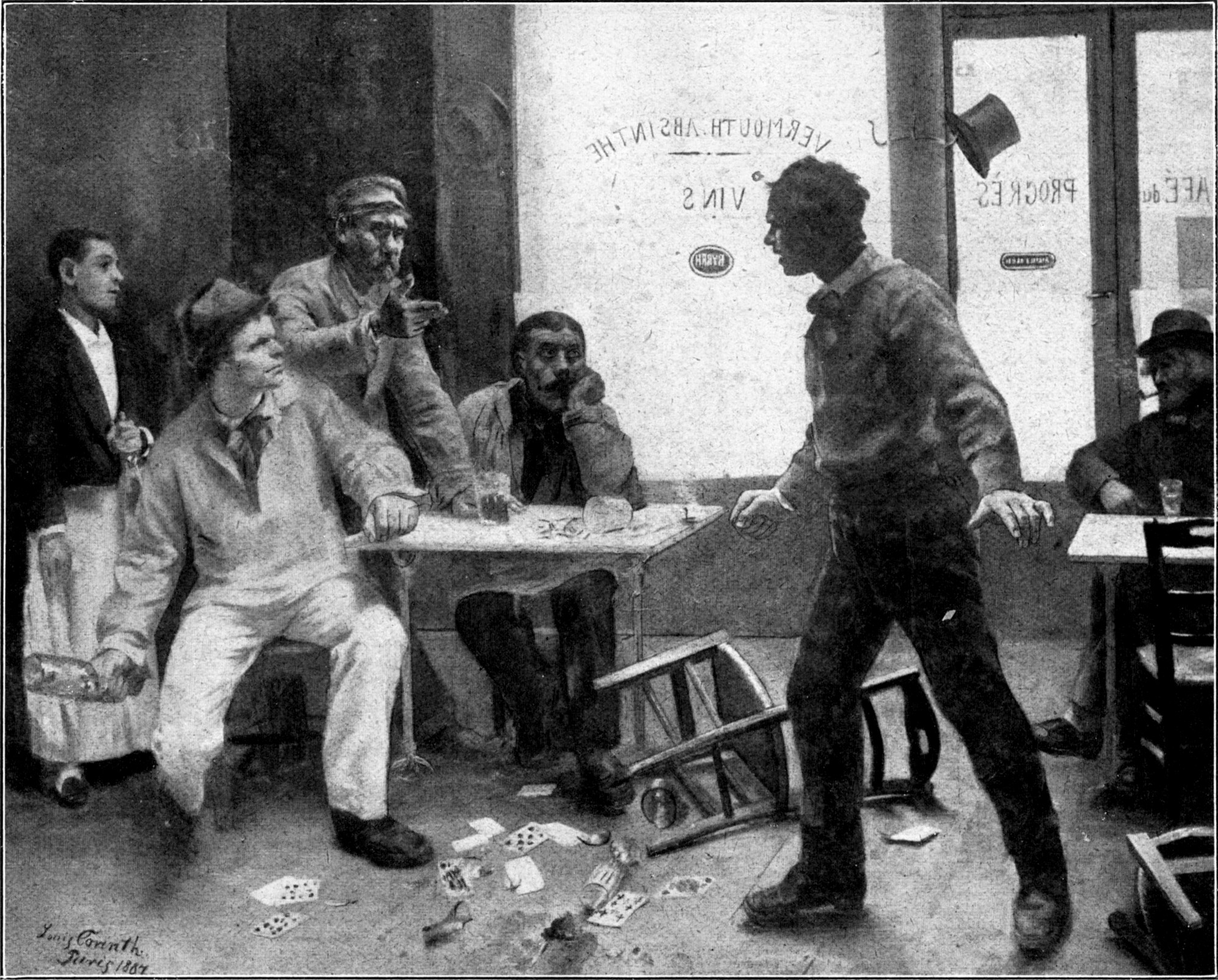 Andere Arbeiten führen unmittelbar zum Atelier der Akademie Julian hin, so der weibliche Akt (Abb. 5 u. 6), während die hier wiedergegebene Komposition unter dem Titel die „Falschspieler“ (Abb. 9) wie das vorher genannte „Komplott“ in stärkerem Maße für die damals bevorzugte Kunstrichtung als solche charakteristisch ist. Das Bild existiert leider nicht mehr. Es ist später in Berlin einmal abgelehnt worden, und da mag es der Meister in einem Moment des Unmuts zerstört haben. Und doch wird man gerade diesen Verlust im Hinblick auf die überhaupt spärlichen Proben aus der Frühzeit doppelt bedauern. Denn Corinth hat hier bereits mit selbstherrlicher Meisterschaft eine höchst dramatische Szene wundervoll darzustellen vermocht, wie auch das ganze Milieu dieser Apachenkneipe als Kulturdokument[S. 47] besonders wertvoll ist. Die Gruppe der in Zwist geratenen Menschen hebt sich scharf von dem von außen in die Kaffeeschenke hereinflutenden Licht ab, und jede Bewegung ist hier mit fast photographischer Treue erfaßt.