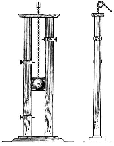 2. Column Indicators.—A very simple indicator, and one that was formerly very commonly used, is made by inserting a pin into the center of the end of the drum shaft and using this as a miniature drum on which to wind and unwind a chain or cord, which corresponds to the hoisting rope as the pin corresponds to the drum. This chain or cord is led over a pulley placed at the top of a pair of guides, [Pg 2] representing the shaft, and carries at its end a weight, pointer, or gong, representing the cage or car, as shown in Fig. 1.