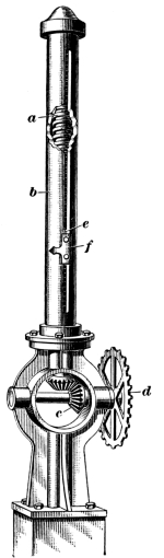 3. An indicator should have a positive motion and be driven by gearing or by link belts. Fig. 2 shows a column indicator that consists of a screw a working inside of a slotted pipe b, which may be of any length necessary. This screw is revolved by means [Pg 3] of the gears c, which are rotated by the sprocket wheel d. A nut e travels up and down the screw a and the pointer f attached to the nut indicates the position of the cage in the shaft. The pipe standard b is usually painted a dead black and the different levels may be marked on it with chalk or white paint. Chalk marks are not safe, as they may be tampered with and the engineer thus misled.