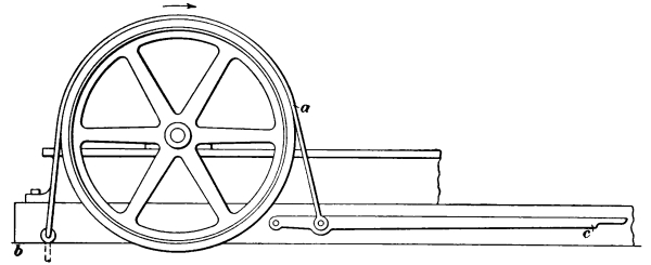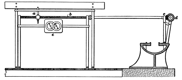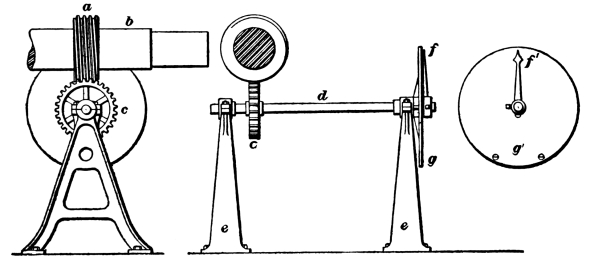 4. Dial Indicators.—Fig. 4 shows a positive-motion indicator that is operated as follows: A worm a on the drum shaft b [Pg 4] engages with the worm-wheel c on the small shaft d that is supported by the bearings e. The pointer f is rigidly attached to the shaft d and revolves in front of the properly marked dial g.