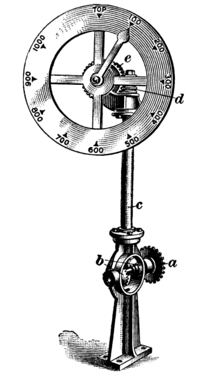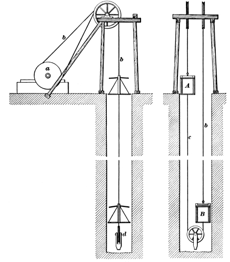 The pointer a, Fig. 3, is moved by the rotation of the screw shaft b, which is revolved by the bevel gears c and d. This indicator also registers the number of hoists by means of the dials e, for at each hoist the lower end of the pointer a engages a ratchet wheel behind the two dial faces shown and thus registers on the dial.