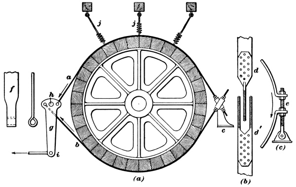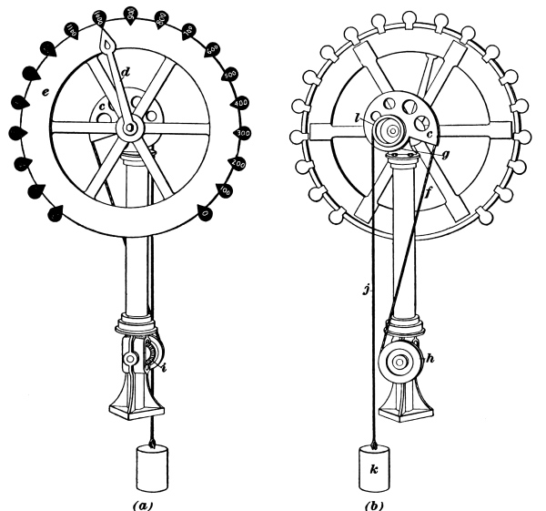 7. Where flat ropes are used or where round ropes wind on a conical drum, the length of rope wound or unwound is different for each turn of the drum. With all the indicators thus far described, while the speed with which the indicator moves is proportional to the speed at which the drum and the drum shaft revolve, it is not proportional to the speed of the rope when winding and unwinding on a conical drum or on a flat rope reel. Fig. 6 (a) and (b) shows two views of a compensating dial indicator. By means of the spiral form of sheave c, the hand d is made to move equal distances around the [Pg 6] disk e for equal distances of cage movement in the shaft. The rope f passes about the spiral sheave and one end is attached at the small end g of the spiral, while the other end is fastened to the periphery of the sheave h, which takes its motion from the drum shaft or crank-shaft of the hoisting engine by means of the bevel gear i. Consequently, while the sheave h has a regular motion dependent directly on the revolution of the hoisting drum, the pointer d moves irregularly, depending on the position of the spiral sheave c; that is, whether a small or large diameter of the spiral is presented to the rope. The rope j carrying the counterweight k is attached to a small circular drum l that is on the same shaft as the spiral sheave. The purpose of this cord and counterweight is to keep the indicator line f taut and to bring the indicator back to position as the cord f unwinds from the sheave h.