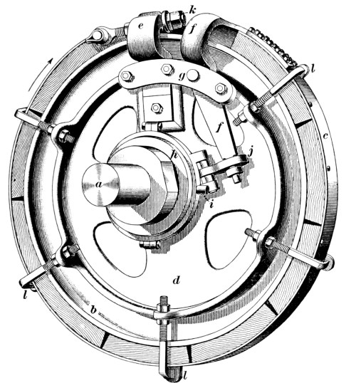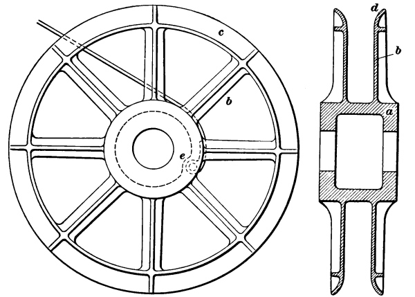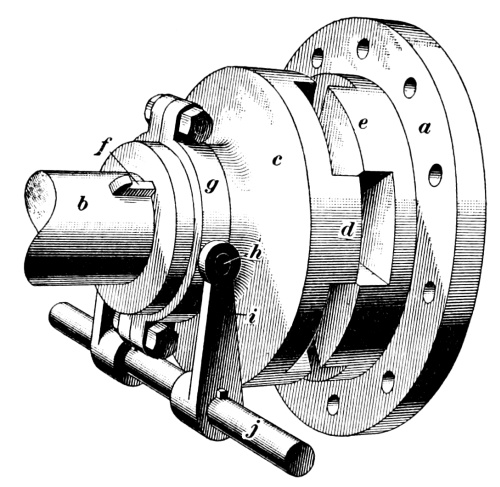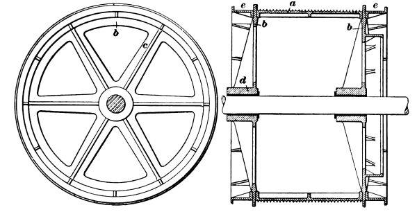 27. Pneumatic Fans.—A pneumatic fan, shown in section in Fig. 26, is one in which the shock of the landing is partially relieved by a cushion of compressed air. The fan is keyed at the bottom to the [Pg 29] shaft a that rotates it, as in Fig. 24. The cylinder b contains the plunger c, which is kept at the top limit of its motion by the spring d. When the cage lands in the jaw e, the plunger descends, compressing the air in the cylinder b. The air escapes slowly through the ¹/₁₆-inch hole f, thus allowing the cage to settle into place with very little shock. These fans should be made of wrought-iron or cast-steel so as not to be easily broken.