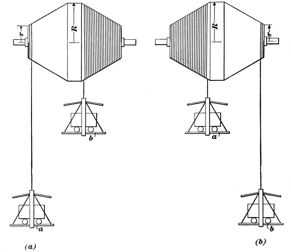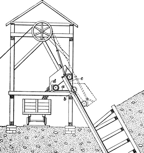 15. Slope, or Inclined-Shaft, Hoisting.—In a slope, or inclined shaft, the mine cars are attached directly to the hoisting rope and hoisted singly or in trains for inclinations less than 35°, at which inclination the material will begin to fall from the top of the car. For steeper slopes, it is customary to use a slope cage or carriage on which the mine car is hoisted, or else to dump one or more cars of the material into a gunboat, or skip, at the bottom of the slope or at some landing along the slope, and to then hoist the gunboat, or skip.