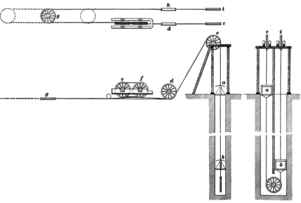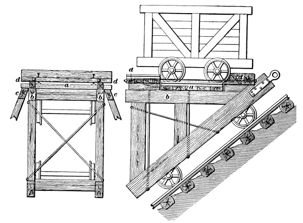 The carriage, Fig. 13, is for use on slopes of a uniform inclination. It is made almost entirely of heavy timber, is stiff and simple of construction, and is easy to repair. Its details will be readily understood from the illustrations, except perhaps, the device for locking the car to prevent its running off during the hoist. The middle portion of the platform a having a piece of the car track on it, [Pg 17] may move vertically up or down. As shown in the side elevation, it is resting on the horizontal timbers b of the carriage in a position ready for hoisting. At the end of the hoist, when the cage settles on the keeps c, shown in the end elevation, this platform reaches them first and is supported by them while the rest of the carriage descends still farther until the timbers d rest on the keeps also. The track on the platform a is then at the same level as that on d, and the car can be run off and replaced by another. When the empty car is on, the carriage is lifted from the keeps, but the platform a remains until the timbers b pick it up, when the keeps are swung back out of the way and the carriage is lowered.