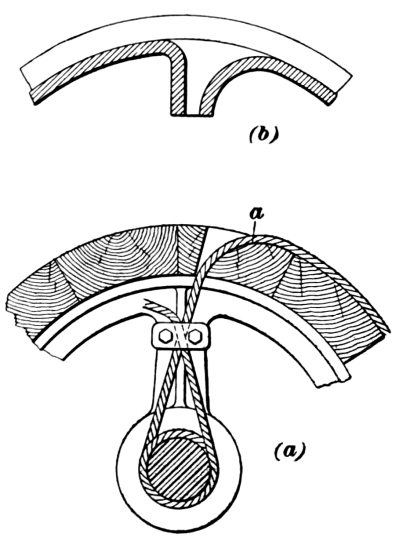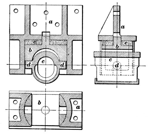 As the skip is not detached from the hoisting rope, time is saved at the top over that needed to unhook and hook the cars to the rope or to remove and place the cars on the cage. But since dumping the material into the skip and again on the surface produces considerable fine material, skips, or gunboats, are seldom used for any material, such as coal, that is often lessened in value by being broken. The skip, or gunboat, shown in Fig. 14 is closed along the top a and open at the end b, which is cut at about the angle of the slope in which it is to be used, so as to remain practically level during the hoist. It is made of sheet iron, the bottom, sides, and top being stiffened by angle or T irons, and the back stiffened and protected by 3-inch planks, backed by 3" × 6" timbers. The wheels of a skip are fixed on the axles, which run in journal boxes, thus insuring smoother running [Pg 18] than is obtained with loose wheels. The details of the journal bearings, as shown in Fig. 15, consist of three castings, the bracket a, which is bolted or riveted to the gunboat, a pivot casting b, and the bearing proper c. The bearing c rests on the axle and carries, by means of trunnions d, the pivot casting b, on the top of which is placed a rubber cushion e to lessen the shocks between the casting and the bracket.