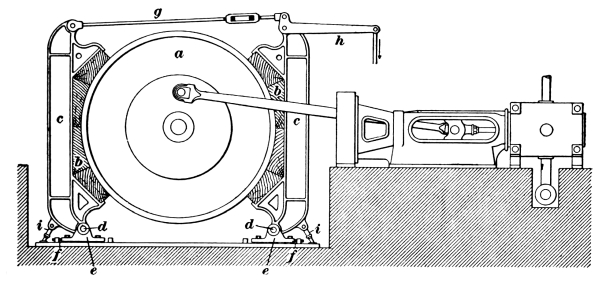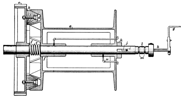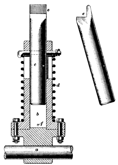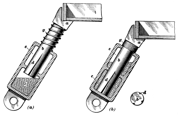If now the cage is lifted and the weight thus removed from the jaw a, the spring g pushes the plunger b outwards and allows the oil to run from e back into c.