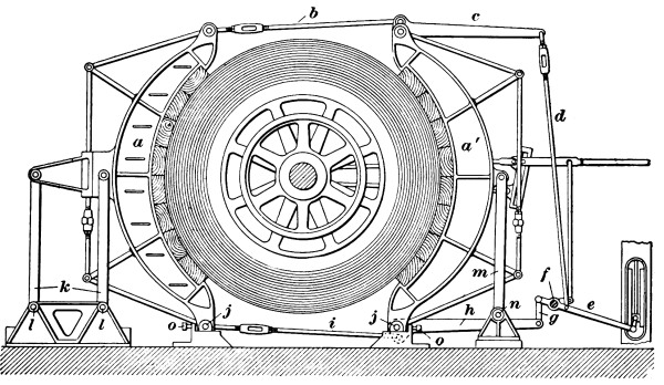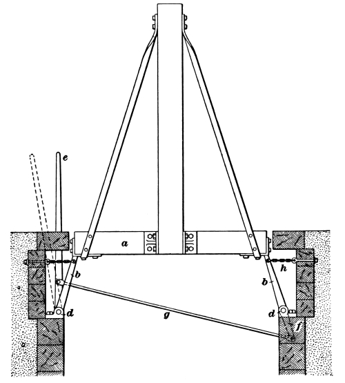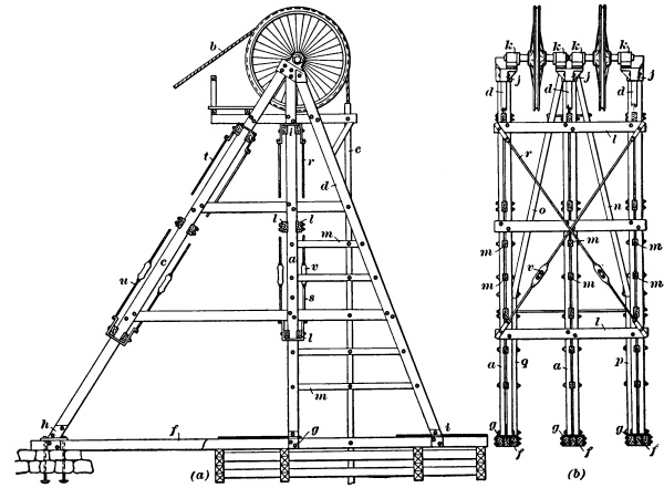 The posts a and the brace c are made up of two pieces of timber each 8 inches by 14 inches in cross-section. The brace d consists of one piece of timber 8 inches by 14 inches in cross-section. The transverse braces l consist of two pieces of timber 6 inches by 14 inches in cross-section, bolted through the timbers a and c. The supports m for the guides are single pieces of 8" × 8" timber. The center post, as shown in Fig. 32 (b), is braced by the two pieces n, o, which are supported by two timbers p, q bolted to the two outside posts. The posts a and the inclined braces c are further braced by the tie-rods r, s, t, and u, all of which are fitted with turnbuckles, as shown at v. The different posts are firmly bolted together, the bolts being fitted with cast-iron washers. [Pg 37]