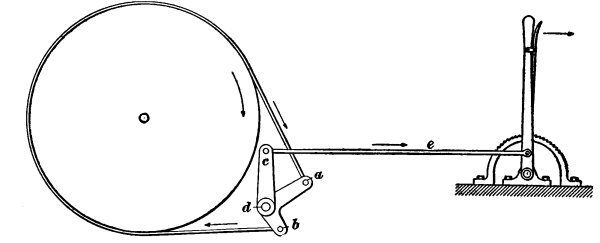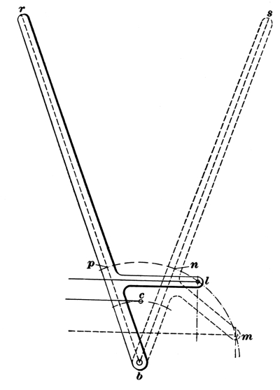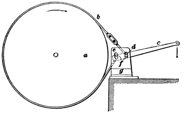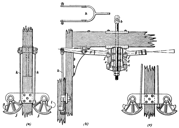 It is possible to dispense with the guide rail h by attaching a flange to the top of a at the back, to slide on the main guide k. This flange should be shorter than the shoe on b. The main guide is cut away at the point where this flange comes when the wheel g enters the curved guide j, leaving an opening just large enough to allow the flange on a to pass through. The shoe on b, being longer, completely spans the space and cannot pass through, but makes b move straight up on the main guides.