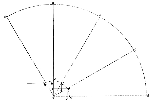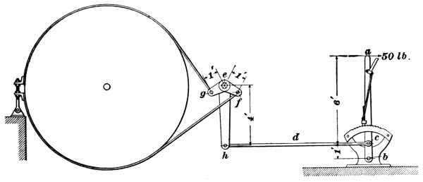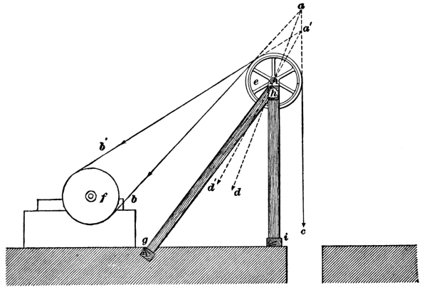 The direction of the resultant force may be obtained by drawing a line through the intersection of the lines of action of the forces at g and the center of the head-sheave b, as may be seen in Figs. 28 and 29.