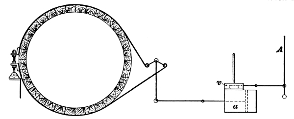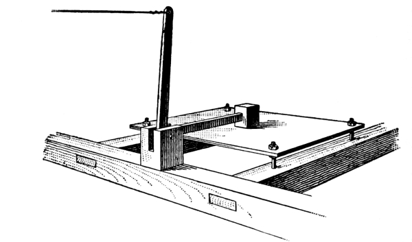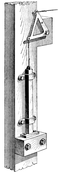 45. Hammer-and-Plate Signal.—Fig. 40 shows a hammer-and-plate signal, the plate being a piece of boiler iron or steel. The hammer is [Pg 49] often located beneath the plate instead of above, as shown. Another style of hammer-and-plate is shown in Fig. 41. The hammer is made of 2-inch square iron and heavy enough to balance the weight of wire hanging in the shaft and to take the sag out of the horizontal wire connecting the top of the shaft with the lever a. A simple dial turned by a ratchet motion attached to the lever a is sometimes used to show the number of strokes, and thus check the number counted by the engineer. The dial is reset by the engineer as soon as he understands the signal.