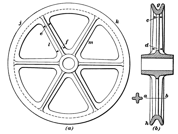 34. A Type of Head-Frame.—Fig. 32 shows the construction of a triangular, or A-shaped, head-frame of which (a) is a side elevation and (b) an end view. This particular frame is largely used at anthracite mines, but the type is one quite commonly used for timber frames, though the details of construction vary in different localities. The height of the frame is from 30 to 50 feet, and with direct-acting engines this height should be sufficient to allow a play of at least two-thirds of a revolution between the cage landing and the overwinding point. The posts a are parallel to the hoisting rope b as it hangs down the shaft and the inclined brace c, which resists any thrust that would tend to rotate the head-frame, is parallel to the resultant pull of the two parts of this rope b; the inclined braces d stiffen the frame and help support the cross-timbers m that support the cage guides e. The sills f are made of three pieces of timber 8 inches by 14 inches in cross-section. The posts a rest in cast-iron shoes g that are firmly bolted to the posts and sills. The inclined braces c, d are fitted with cast-iron shoes h, i. The post a and the two braces c, d are held in place at the top of the frame by the casting j, which also supports the pillow-block k.