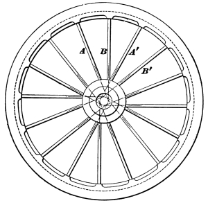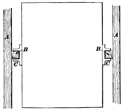 The guides are firmly fastened to the shaft buntons with lagscrews or with bolts countersunk into the guide so as to be clear of the shoes, and, to secure safety with speed in hoisting, the ends of the guides must be put together with joints that are not liable to displacement [Pg 26] and that offer no projections to the shoes in passing. The buntons to which the guides are secured must be so firmly fastened that they cannot get out of place, and the guides must be set as nearly as possible in a straight line, because if they are crooked the cage is thrown back and forth as it travels along them and this not only increases the strain on the hoisting rope and engine, but sooner or later loosens and misplaces the guide. Fig. 23 shows a plan of a cage with the bunton A, guides B, and cage shoes C in their normal positions.