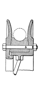 22. Several methods of keeping the car on the cage have already been illustrated: by chains, Fig. 8; by bails, Figs. 9, 10, and 12; by omitting sections of the rail under the car wheels, Fig. 11; and by [Pg 24] dropping a portion of the platform, Fig. 13. A very common way is merely to put a pin through the hole in the drawbar and into the floor of the cage. Another common device consists of a brake block that fits between the wheels and can be thrown in from the side by a lever when the car is in place. Another device consists of a yoke, which, by means of a lever, is raised when the car is in place so that it passes about the axle and thus holds the car. A device frequently used on self-dumping cages is shown in Fig. 22.